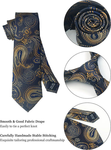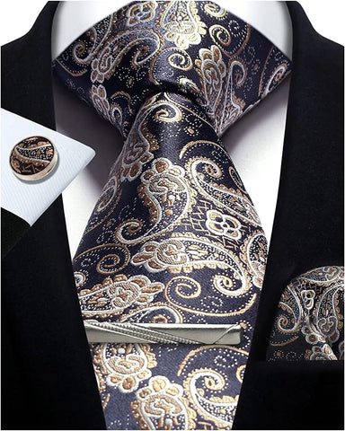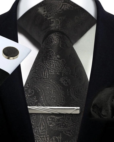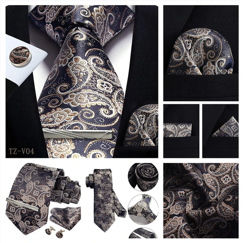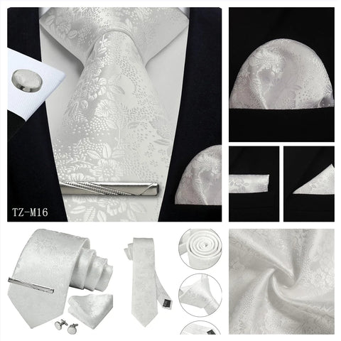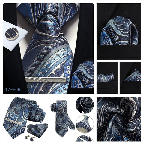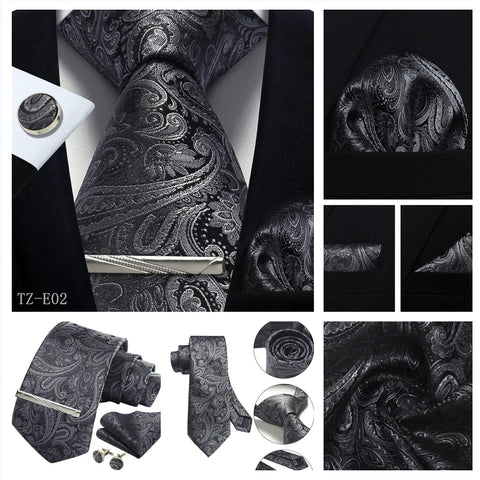 Mens Tie Set Silk Silver Paisley Floral Necktie and Pocket Square Cufflinks Tie Clip Classic Formal Ties for Men Wedding Party