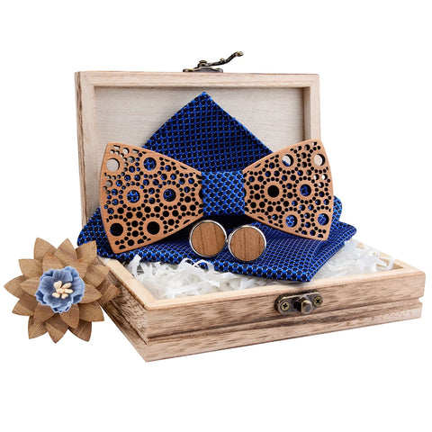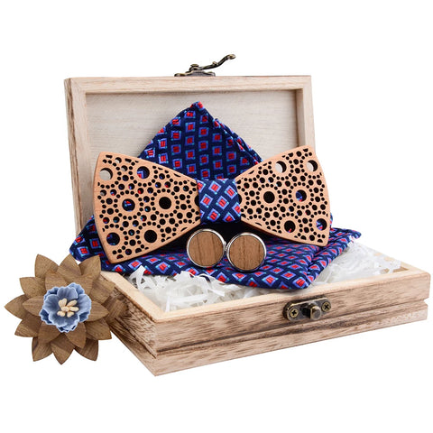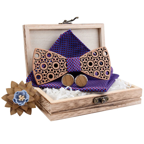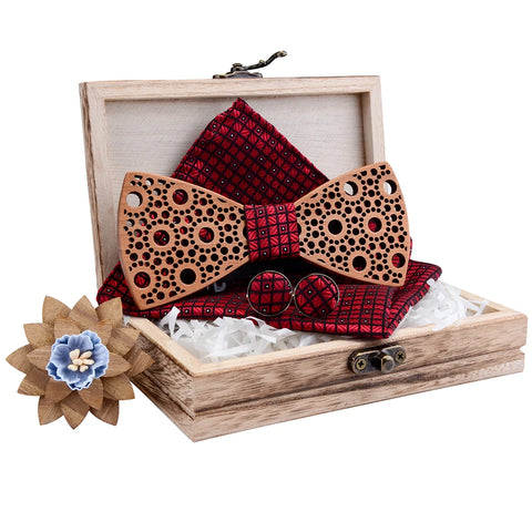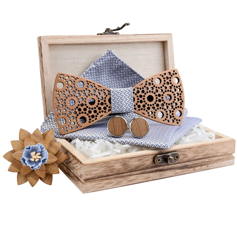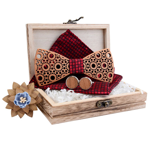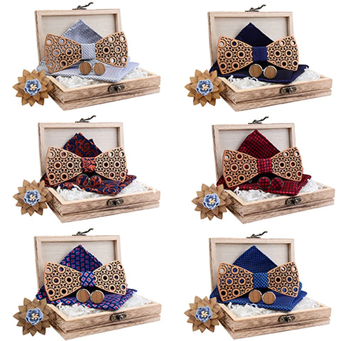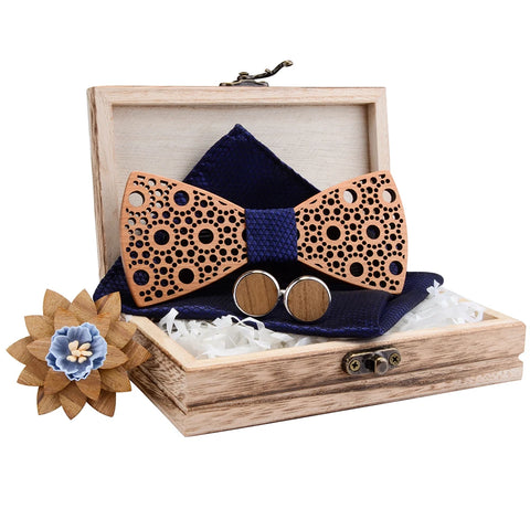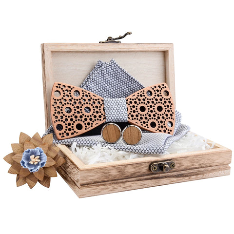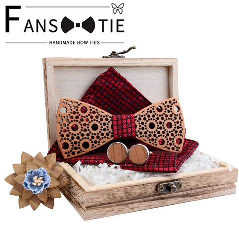New Design 100% Wooden Hollow Wood Bow Ties Bowtie With Pocket Square Cufflinks Brooch For Men Christmas Gift Set With Box Ties
